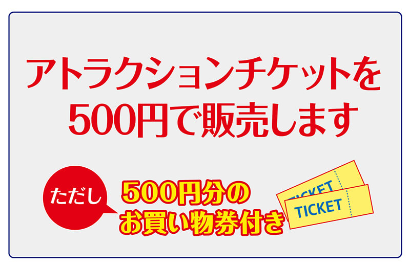 マリタイムプラザ館内で使える500円分の割引券がセットになったアトラクションチケットを500円で販売。各アトラクションに参加しながら館内でお買い物やご飲食をお楽しみください。お買物券は下記店舗にてご利用可能です。