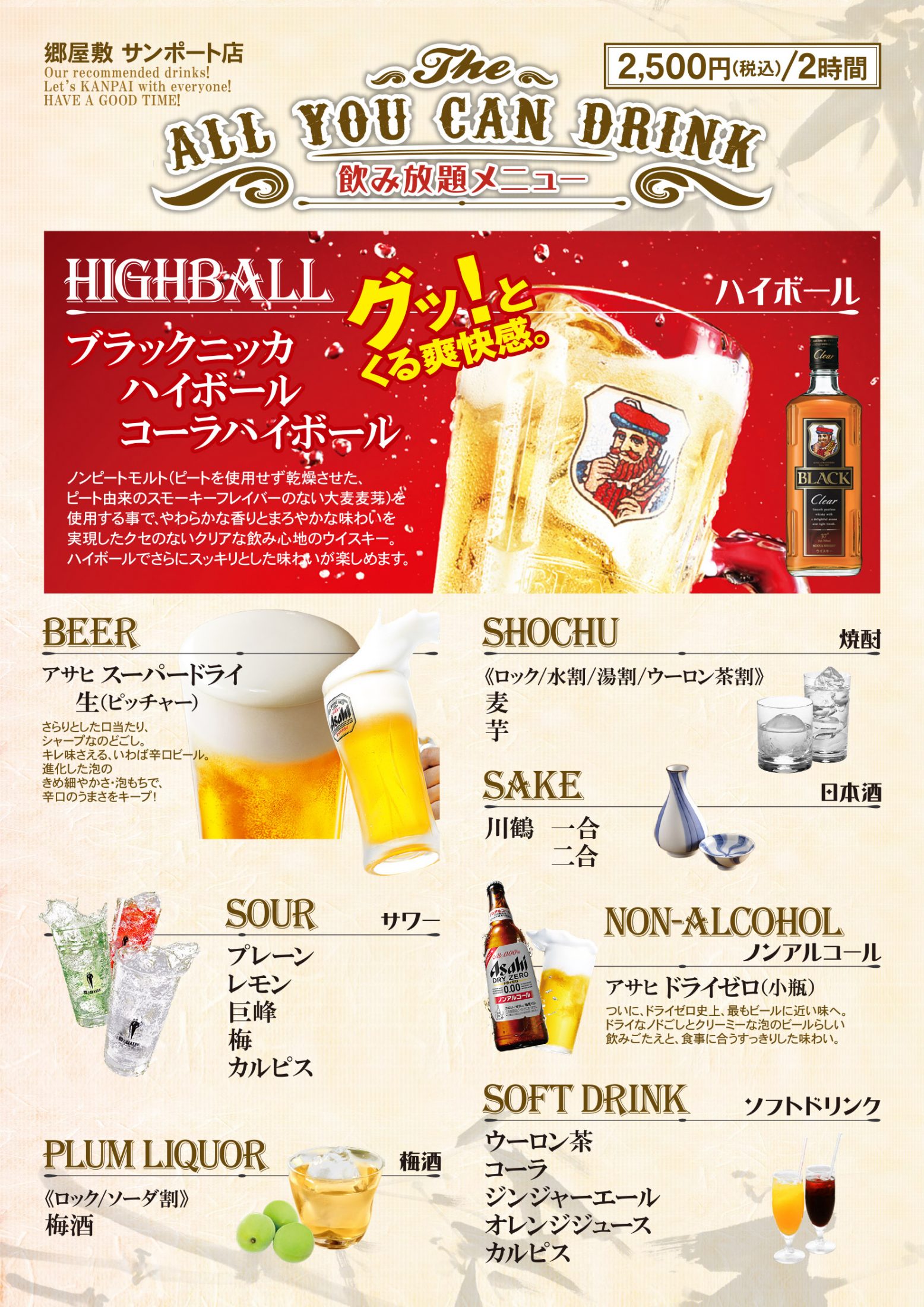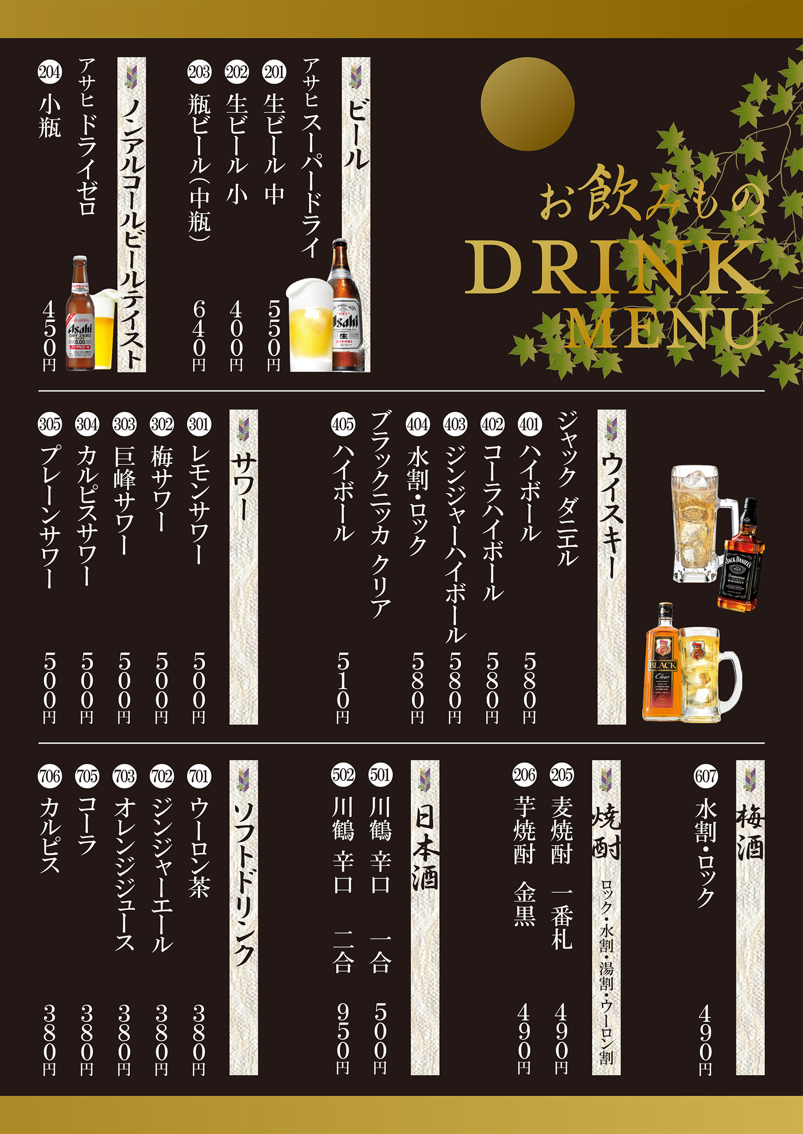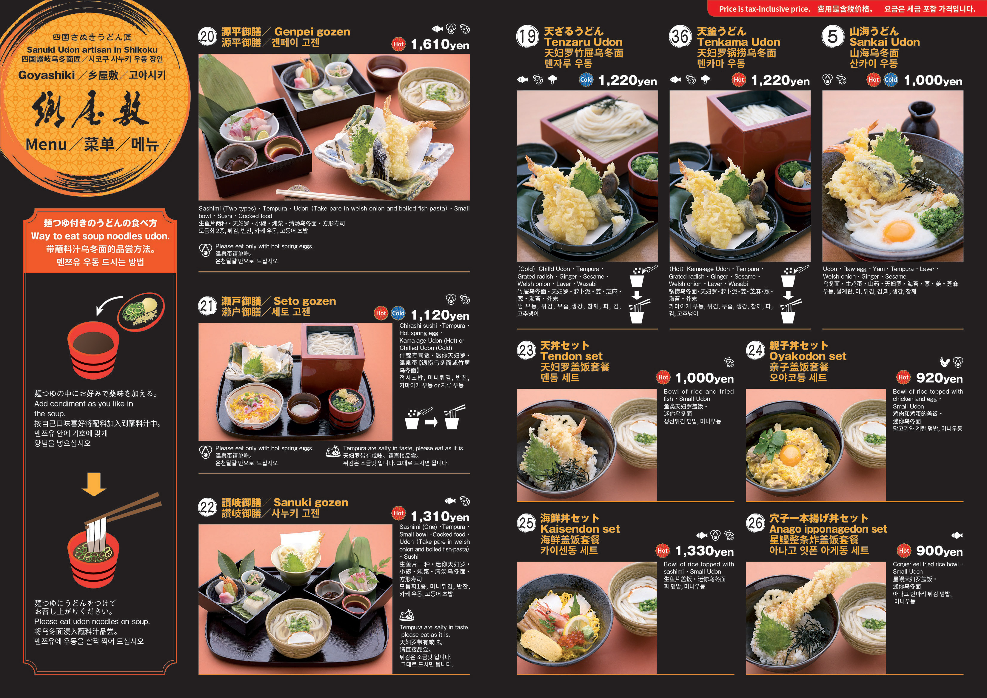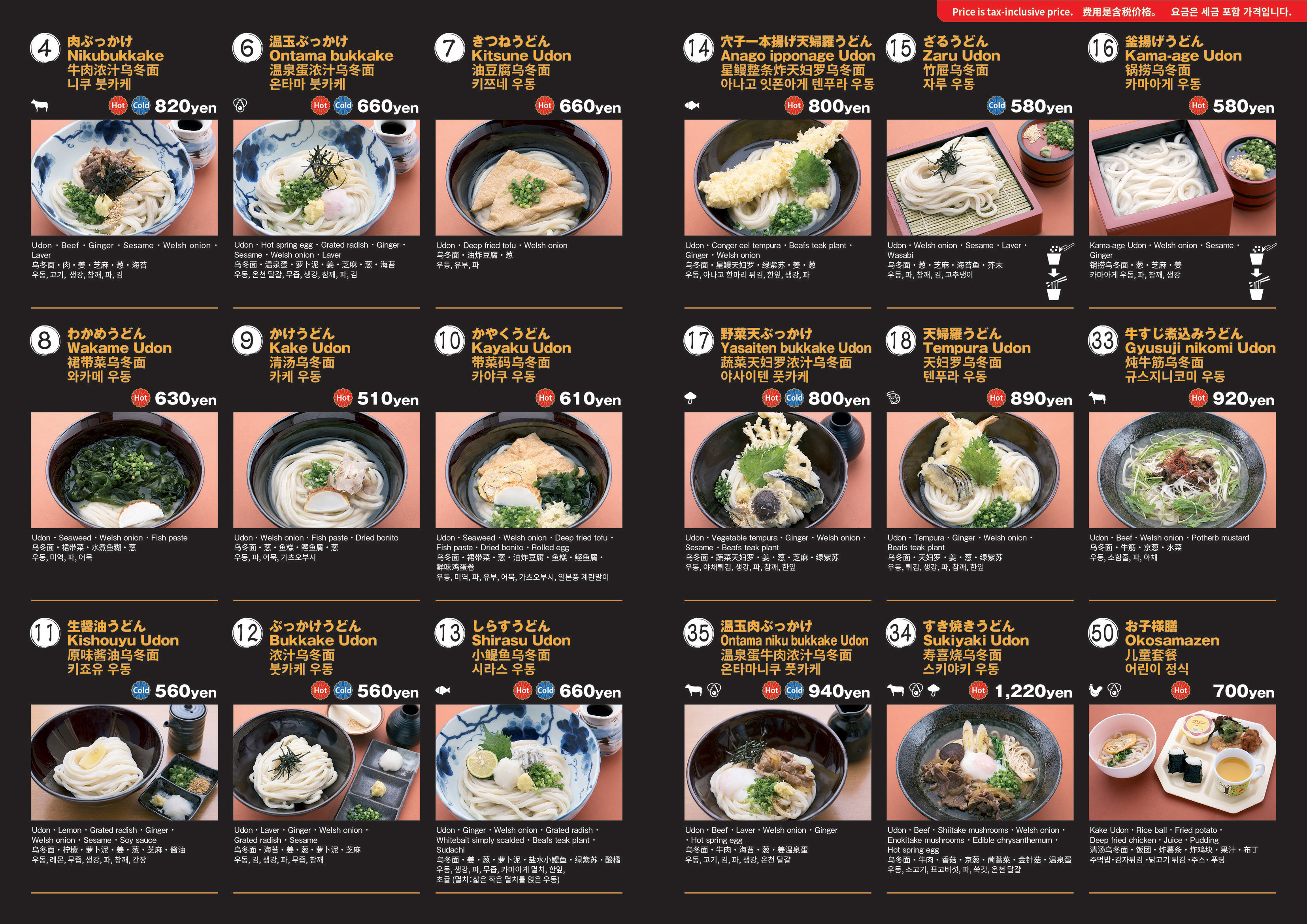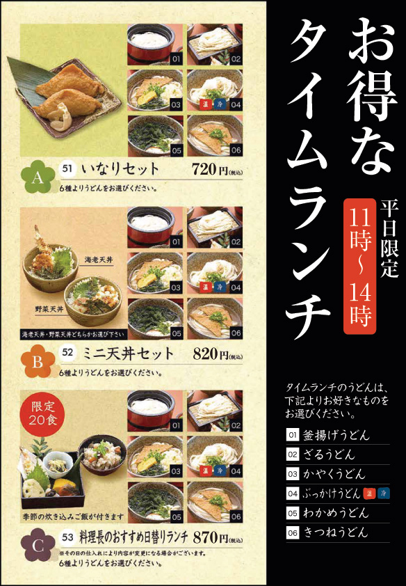 ・かけうどん ・ざるうどん ・かやくうどん ・ぶっかけうどん(温・冷) ・生しょうゆうどん ・釜あげうどん