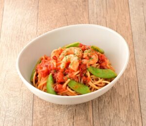 パスタ「海老とスナップえんどうのピリ辛トマトソース」のお知らせです。
