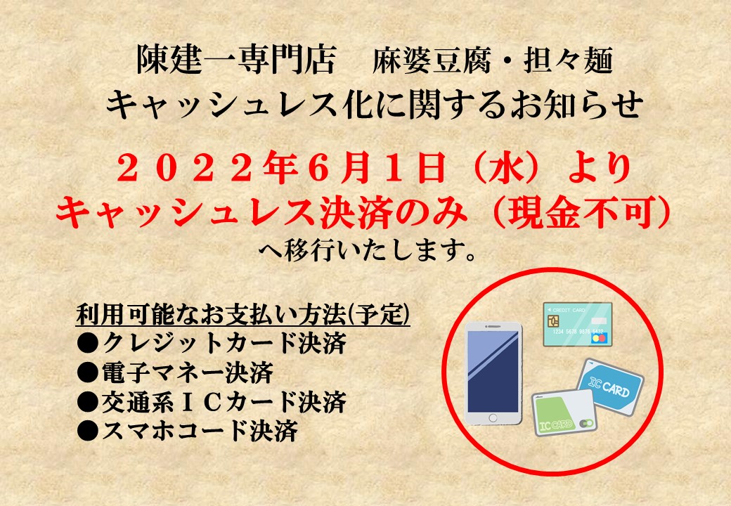 陳建一専門店 麻婆豆腐・担々麺 キャッシュレス化に関するお知らせ