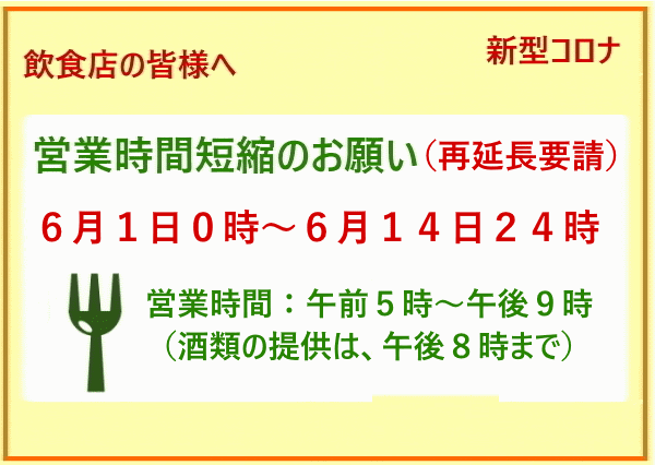 県からの営業時間短縮の再延長要請に伴う営業時間の変更について